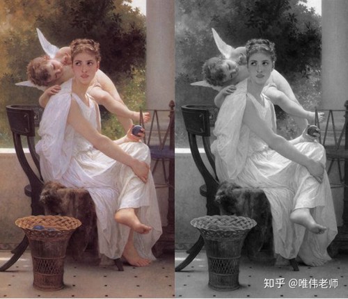 这是安格尔弟子布格罗的油画作品(他画了一辈子美女和小孩),我把它变成黑白效果,大家可以发现也很好看,黑白灰分布明确。